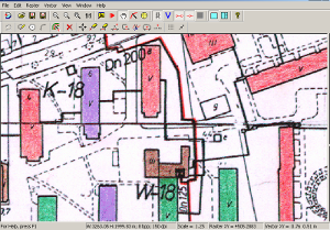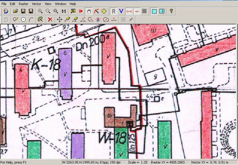 Klient dostarczył w postaci rastrowej schemat sieci cieplnej naniesiony na mapę miasta. Schemat był w skali 1:2000 i rozdzielczości 150 dpi (dokładność wynosi w tym przypadku ok. 30 cm na jeden piksel). Materiał wejściowy wyglądał następująco: