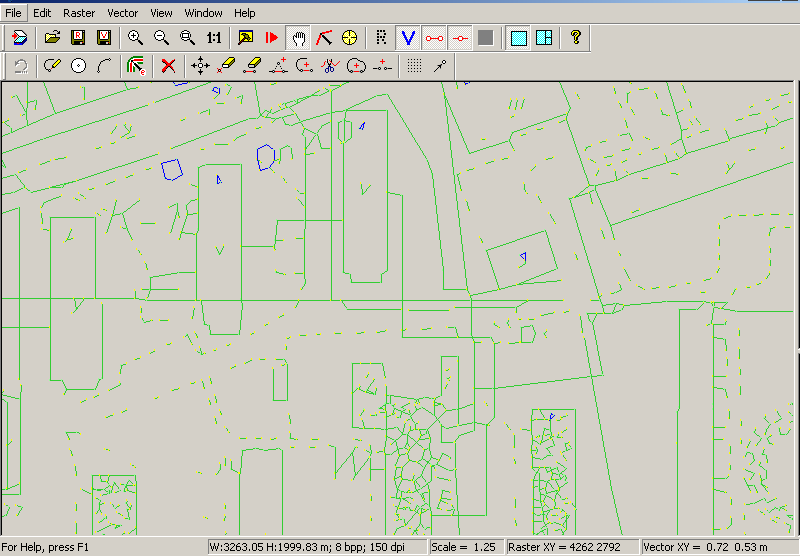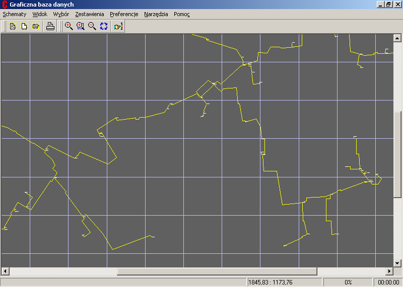 W następnym kroku wektorowym elementom sieci cieplnej zostały przypisane identyfikatory występujące w systemie Calidus. Program konwersji przeniósł do bazy danych informacje o wszyskich interesujących nas obiektach przestrzennych, a więc o komorach, działkach i budynkach. Ostatecznie w systemie Calidus schemat sieci w postaci wektorowej prezentuje się następująco: